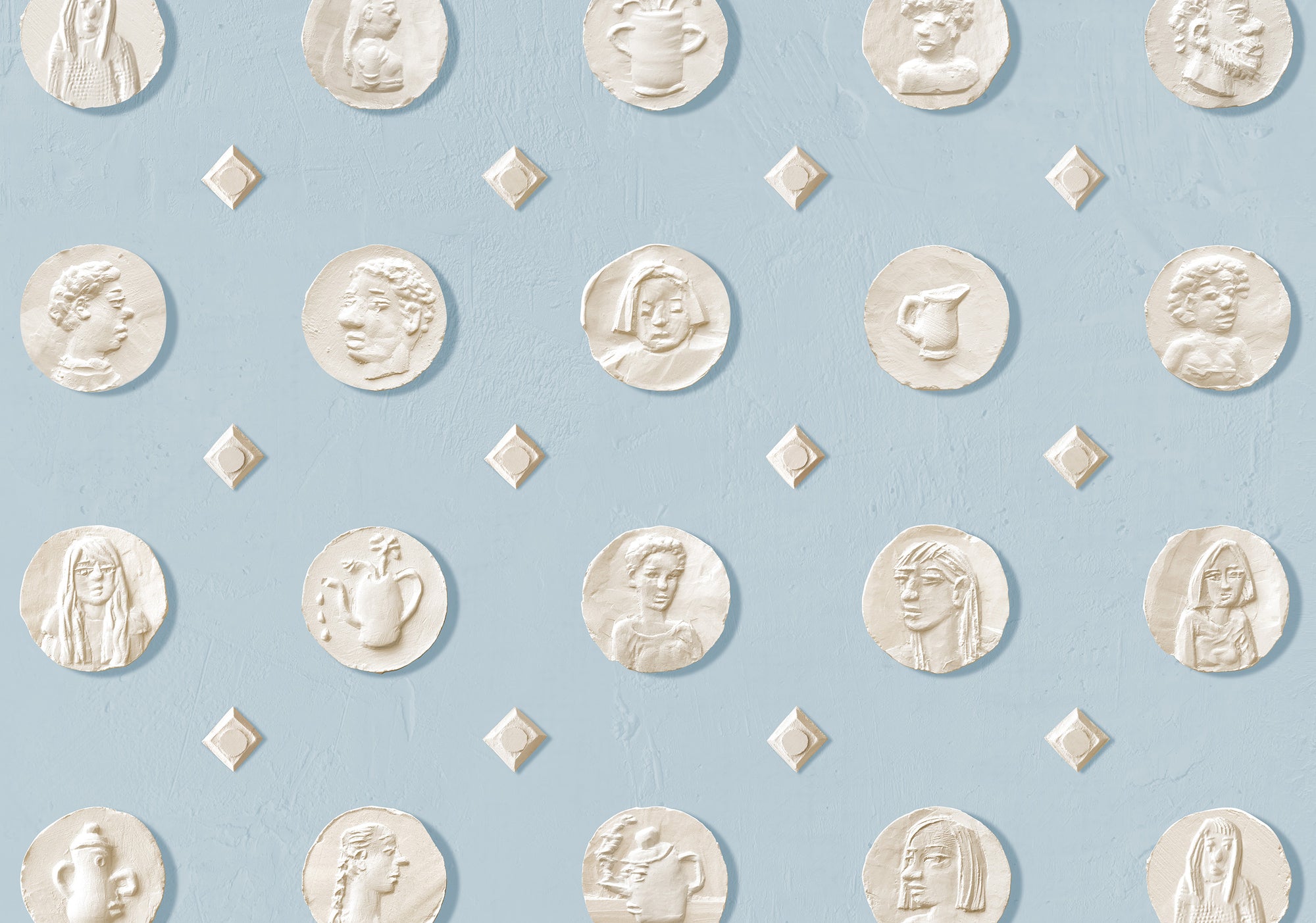 Sculptor Michael Evert has been creating portrait sculptures for many years, along the way he made many small “medals”, almost sketches in plaster for his larger work. Evert photographed a selection of his large collection of medals to capture the light and shadow effect that these dimensional reliefs create. The result is a trompe-l’oeil pattern of people and vessels that showcases the textural medium he works in.