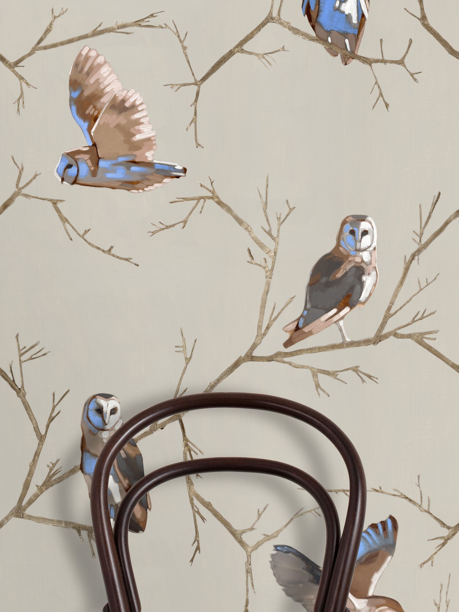 “Parliament of Owls” is a luxury wallpaper design created in collaboration with New York City artist Mitch Ferrin. Inspired by Ferrin’s original oil paintings, it features a tranquil woodland scene where owls gather in quiet harmony—symbols of wisdom, serenity, and natural beauty. The design’s layered, painterly texture brings depth and movement to modern and traditional interiors, offering a sense of peaceful sophistication.