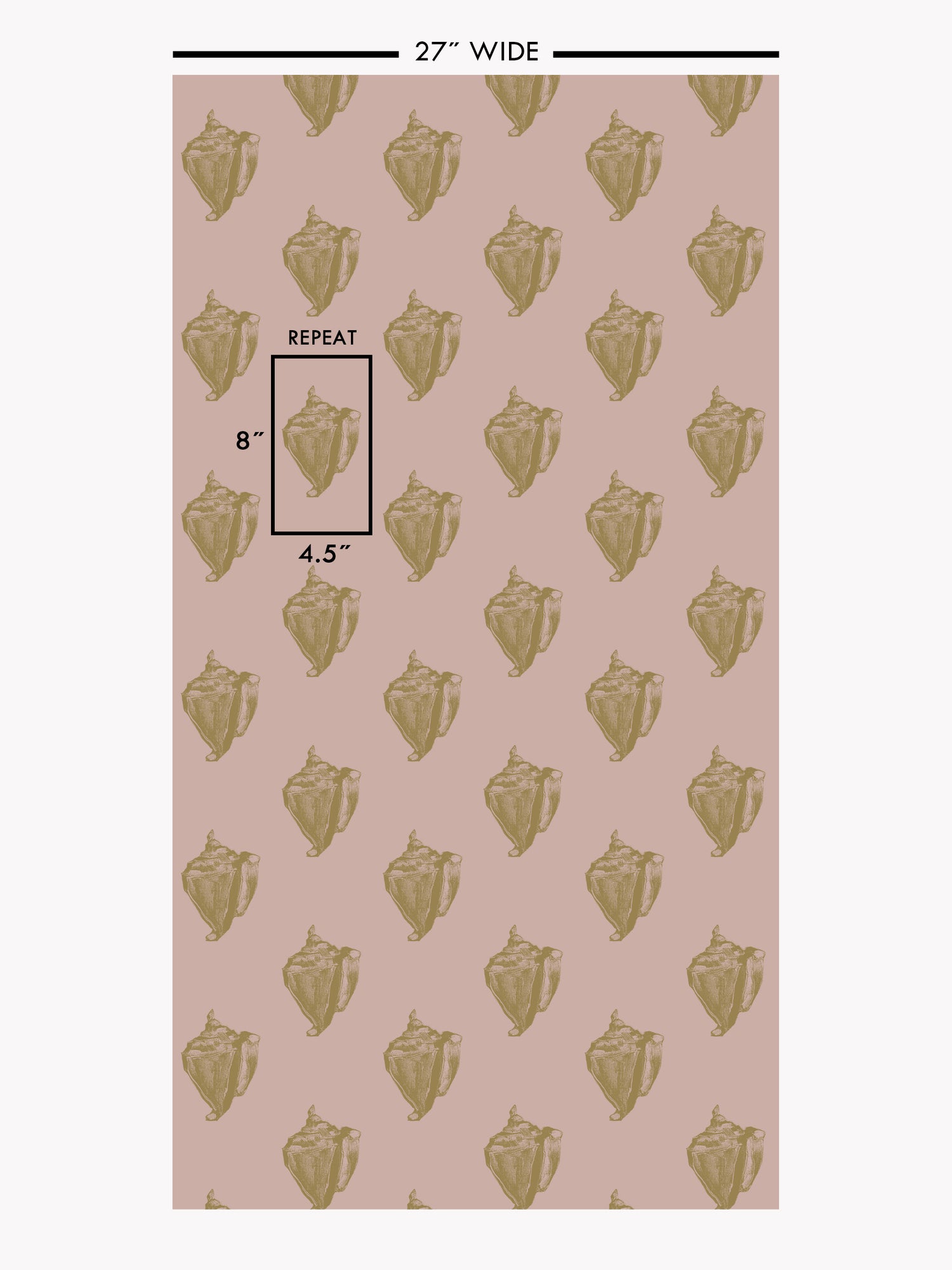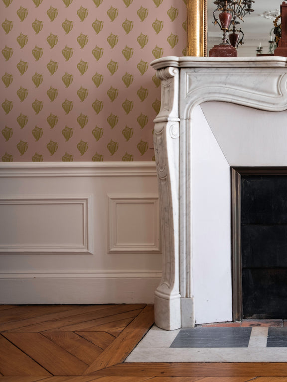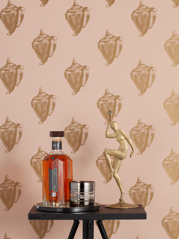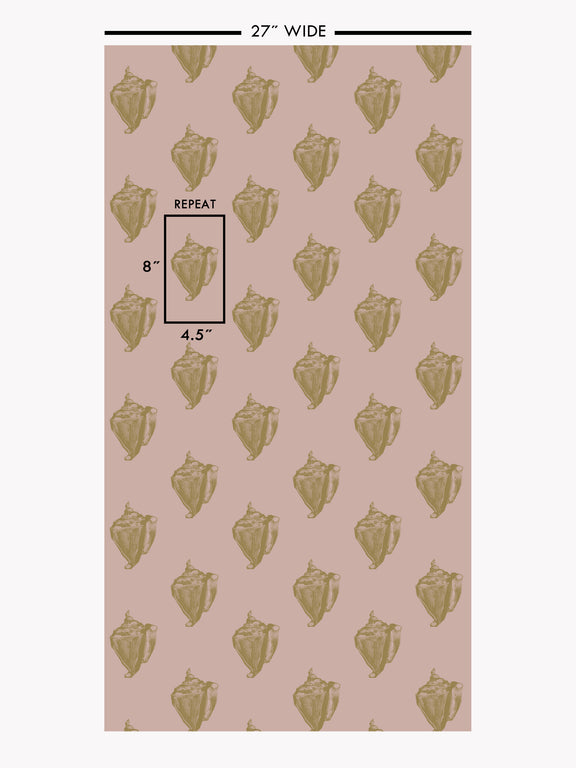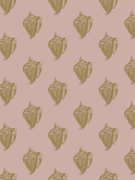 This print captures the essence of the beach with its iconic representation of the conch shell. Designed in collaboration with artist Mitch Ferrin, each intricately hand-screened detail is printed with mineral based gold metallic ink. Whether adorning a feature wall or enveloping an entire room, this wallpaper invites you to immerse yourself in the soothing ambiance of the beach.