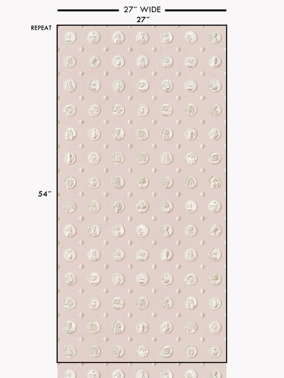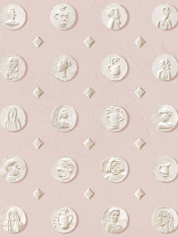 Sculptor Michael Evert’s trompe-l’oeil pattern of people and vessels was created from plaster reliefs he has made over the years. The pattern includes 57 unique medals on a plaster textured background.