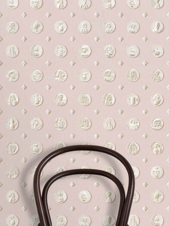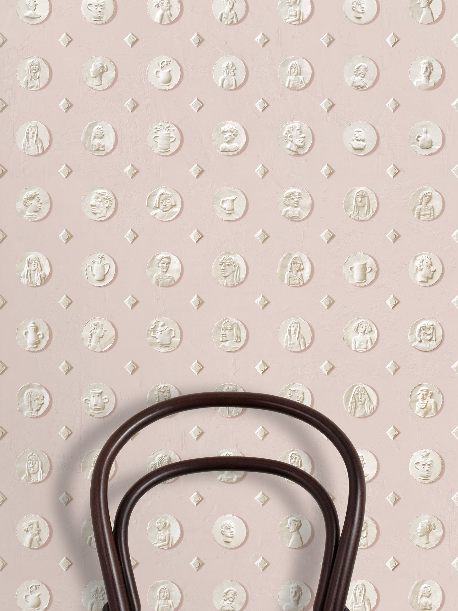 Sculptor Michael Evert’s trompe-l’oeil pattern of people and vessels was created from plaster reliefs he has made over the years. The pattern includes 57 unique medals on a plaster textured background.