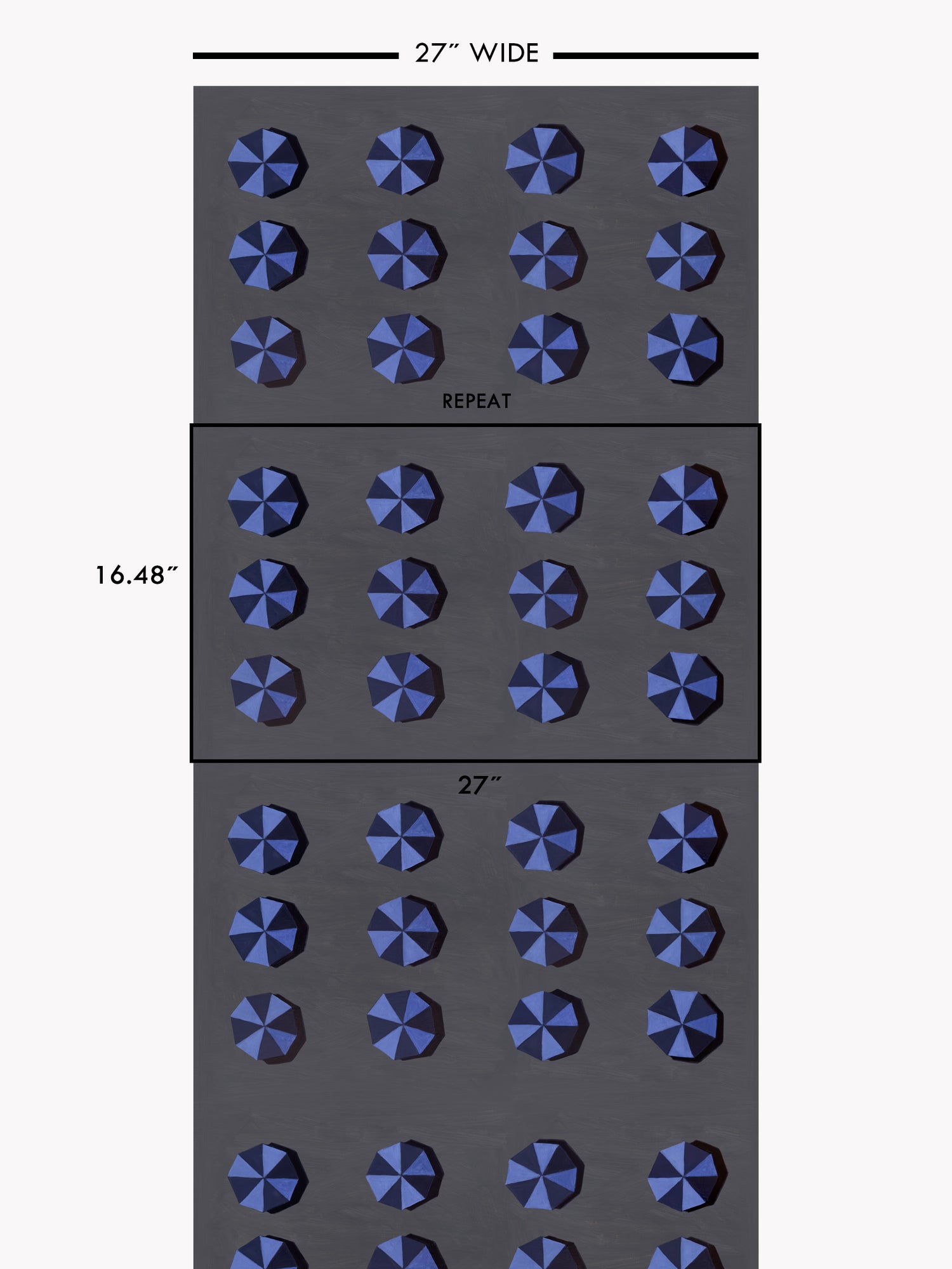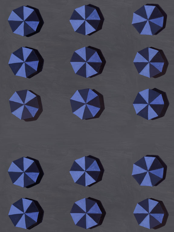 Hand-painted by artist Mitch Ferrin, “Umbrellas” brings the familiar shapes and patterns of the classic beach umbrella to surface design. Ferrin’s expressionist approach brings a tactile quality to the pattern, and his signature observation of time’s passage is present as we watch the sun cast shadows onto the sand.